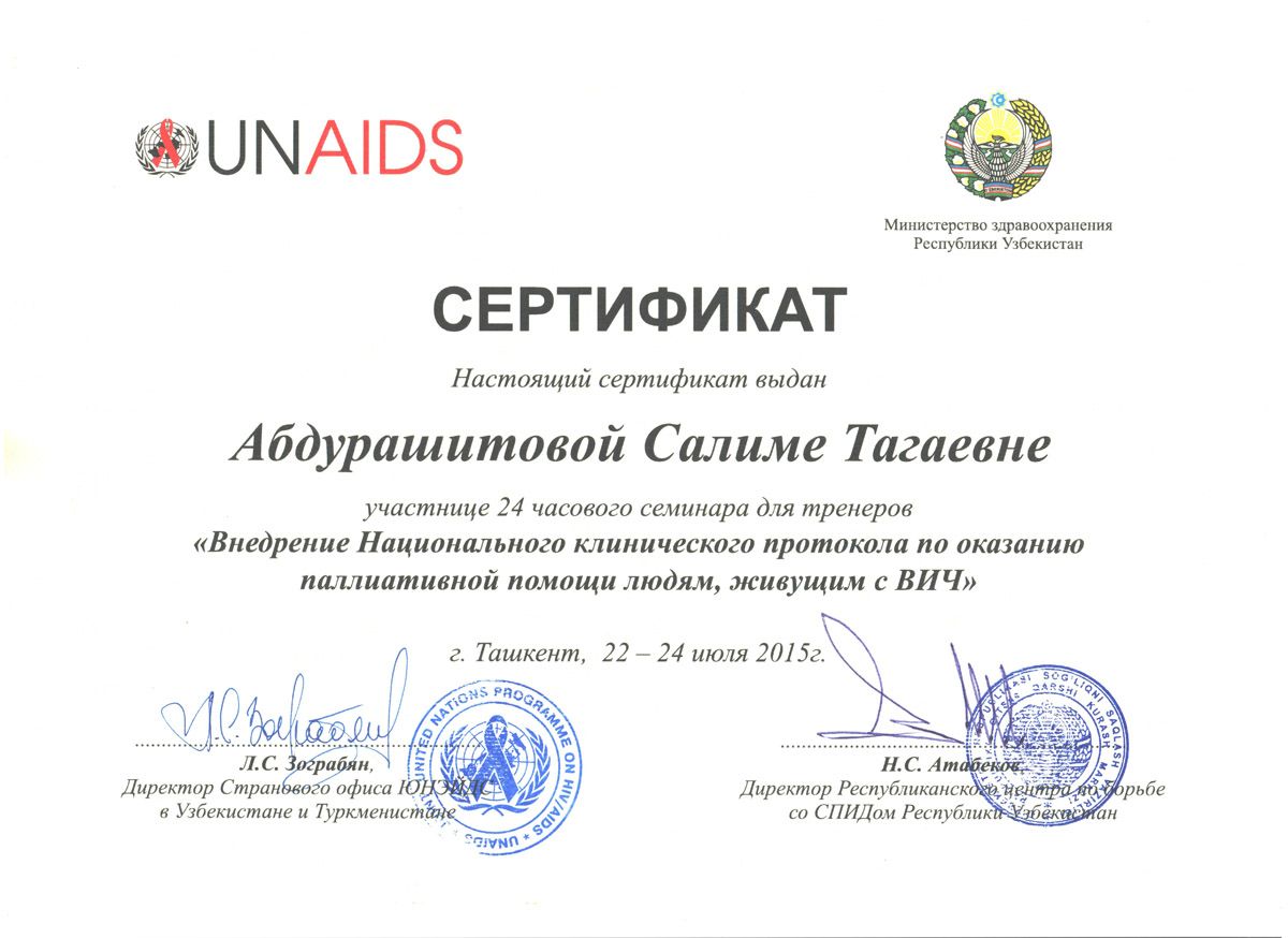 - 2015 г. – сертификат «ВИЧ инфекции»;