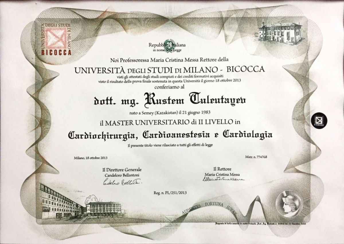 - 2012-2013 гг. – University Milano – Bicocca (Милан, Италия), магистратура по кардиохирургии, кардиологии, кардиоанестезиологии.