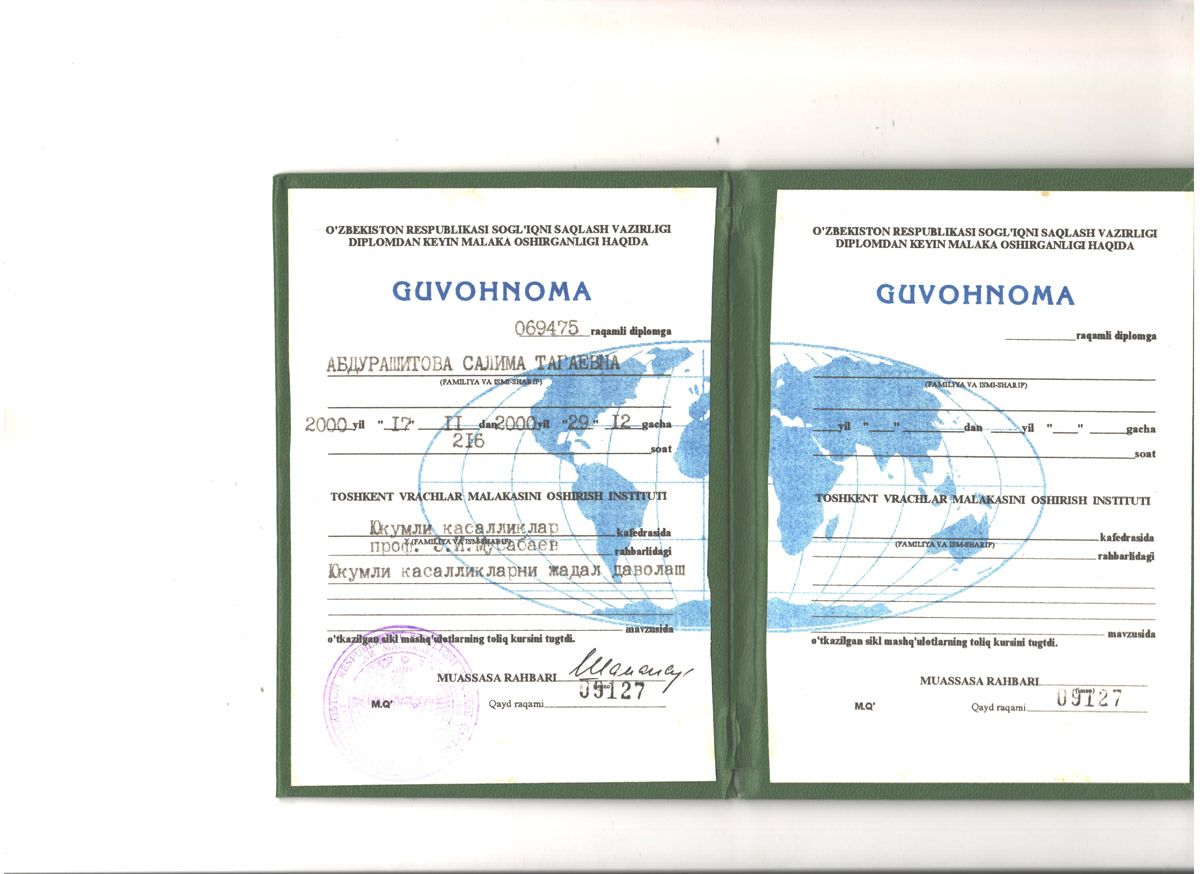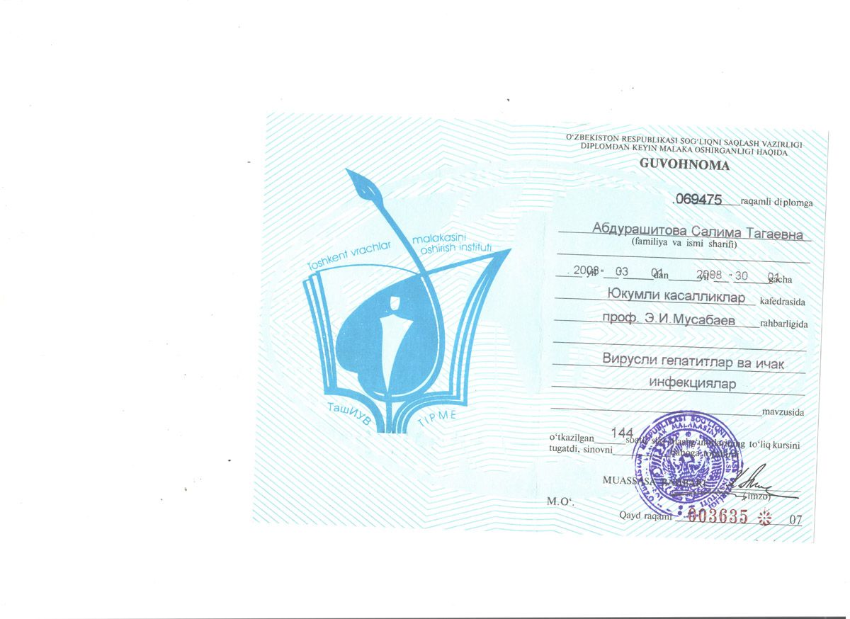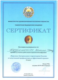 • 2015 ж. - «Созылмалы Вирустық гепатиттер В, С, D» сертификаты;