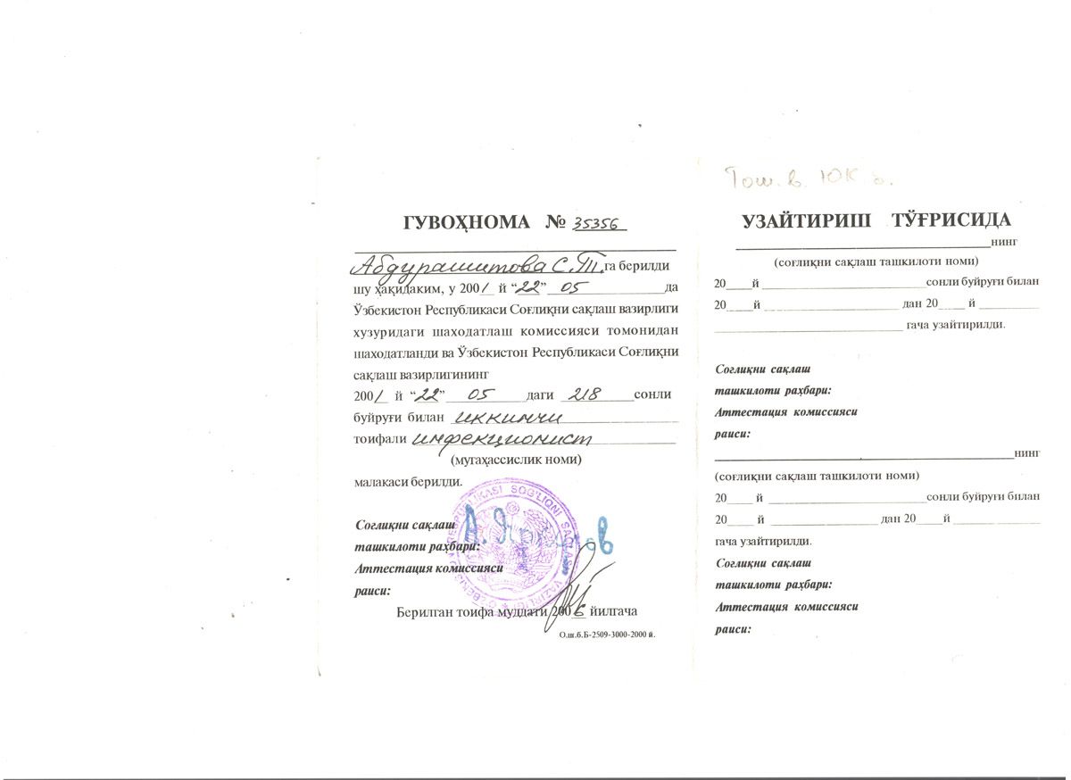 • 1994-2000 жж. - Ташкент қалалық инфекциялық ауруханасы, инфекционист дәрігер;