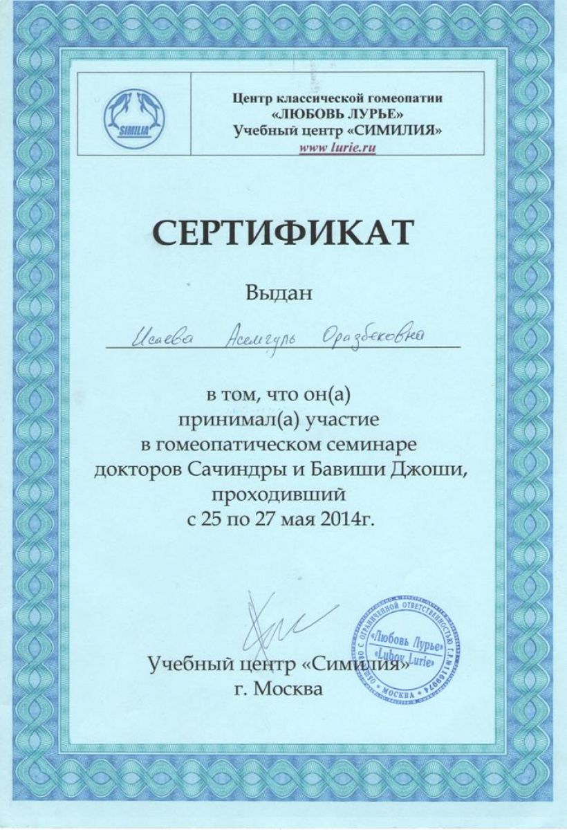 • 1996 ж. – «Гомеопат дәрігер» біліктілігін арттыру курсы.