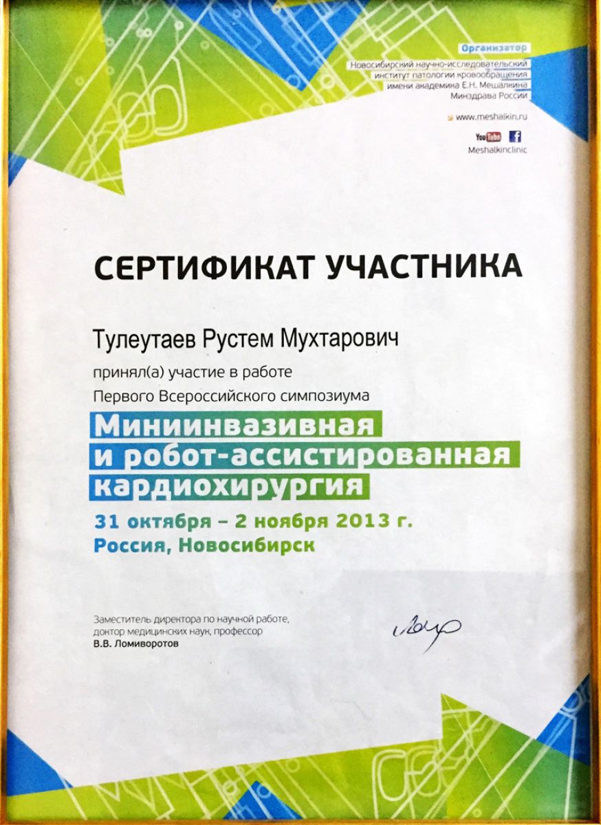 - 2013 ж. – минималды инвазивті және робот-ассисттелген кардиохирургия бойынша тренинг-курс (Новосибирск, РФ);