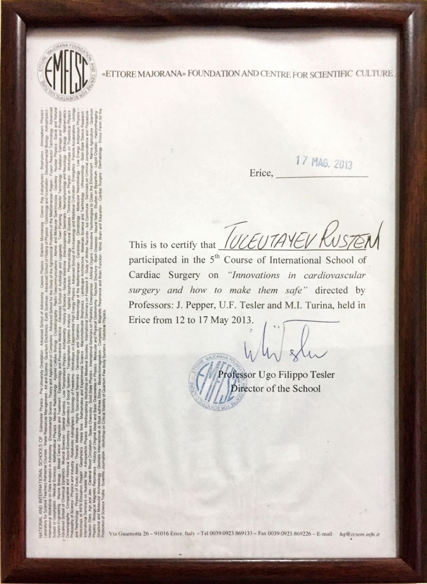 - 2012 ж. – аортаның көтерілу бөлімі мен доғасын хирургиялық емдеу бойынша жетілдіру курсы «How to do it» (Милан, Италия);