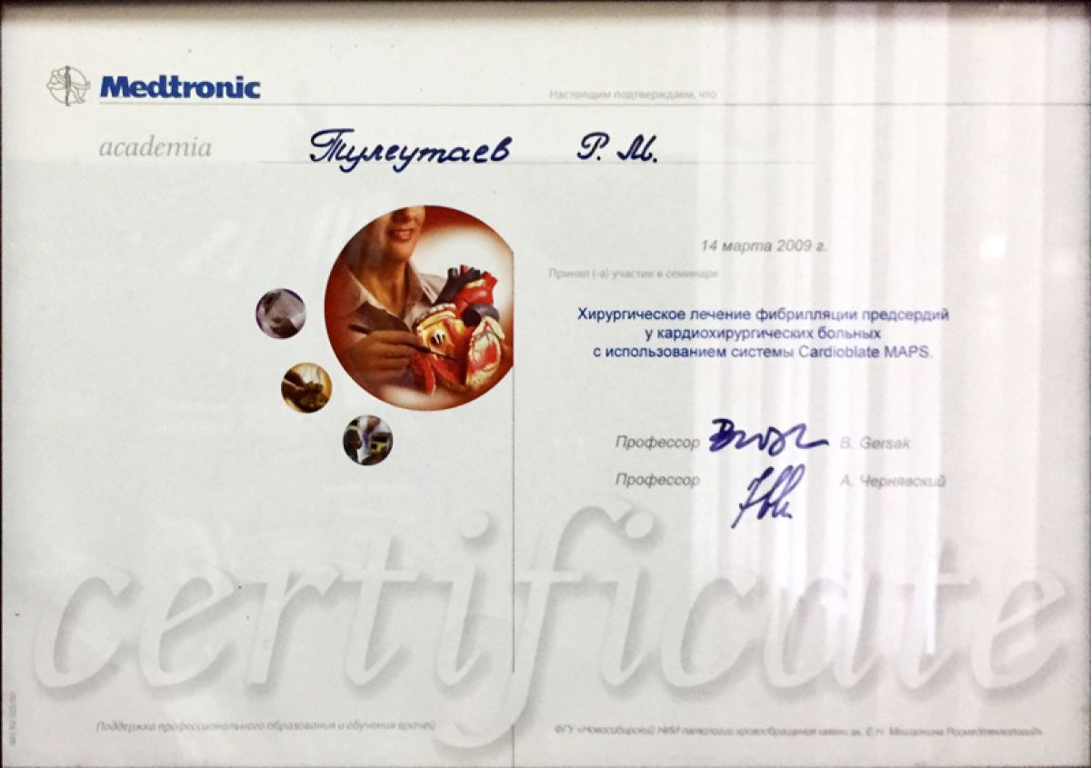 - 2009 ж. – кардиохирургиялық науқастардағы жүрекше фибрилляциясын хирургиялық емдеу курсы Cardioblate MAPS жүйесін қолдану арқылы (Новосибирск, РФ);