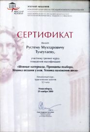 - 2008 ж. – семинар-тренинг «Жіп материалдары. Таңдау принциптері. Түйін байлау техникасы. Тігіс салу техникасы. Эскулап – академия» (Новосибирск, РФ);