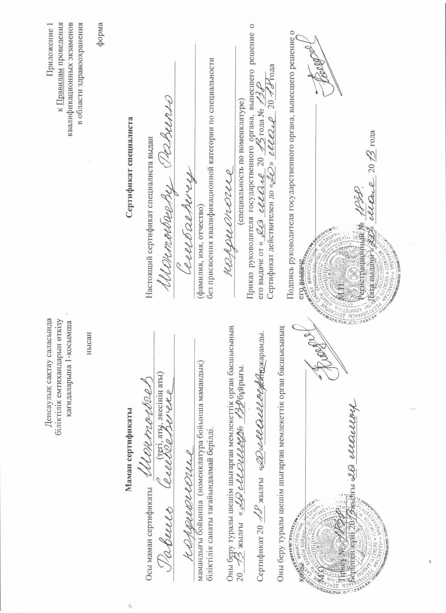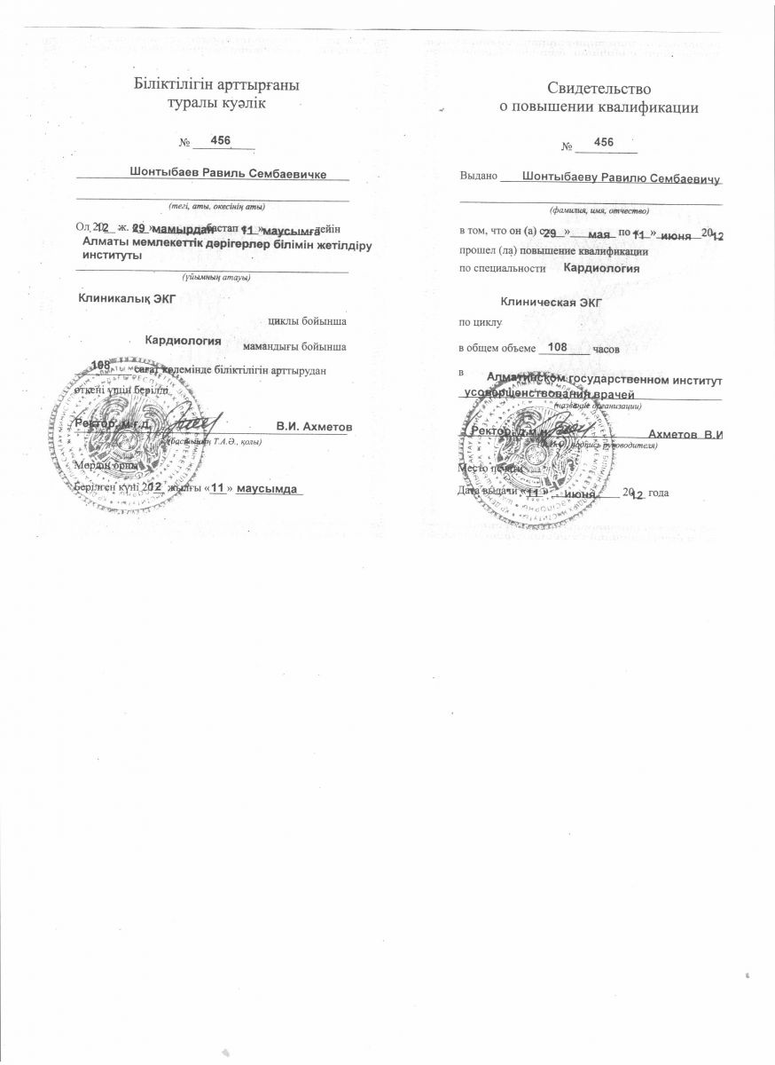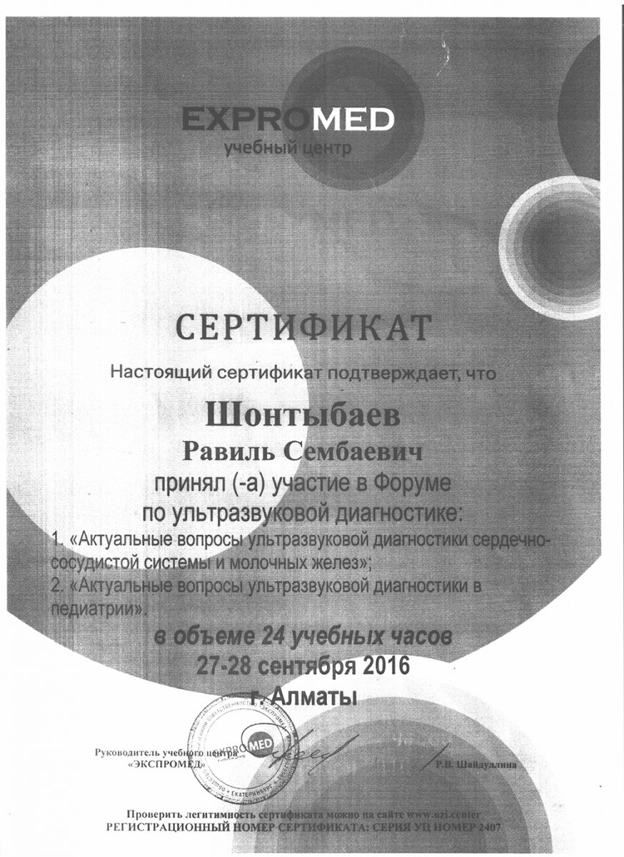 - 2016 ж. – «Клиникалық эхокардиография және халықаралық стандарттарға сай ультрадыбыстық допплерография»;